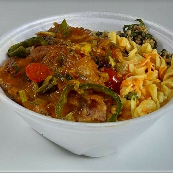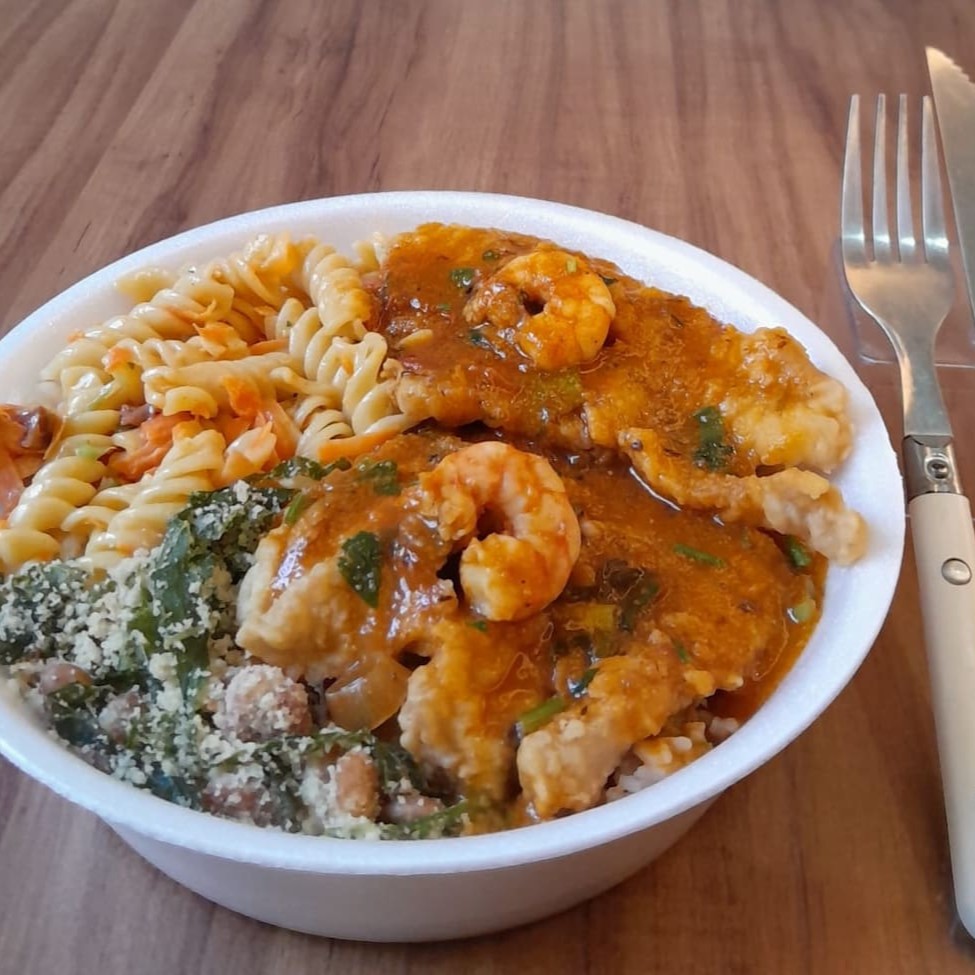 Arroz branco, feijão caseiro, salada de macarronese e farofa.