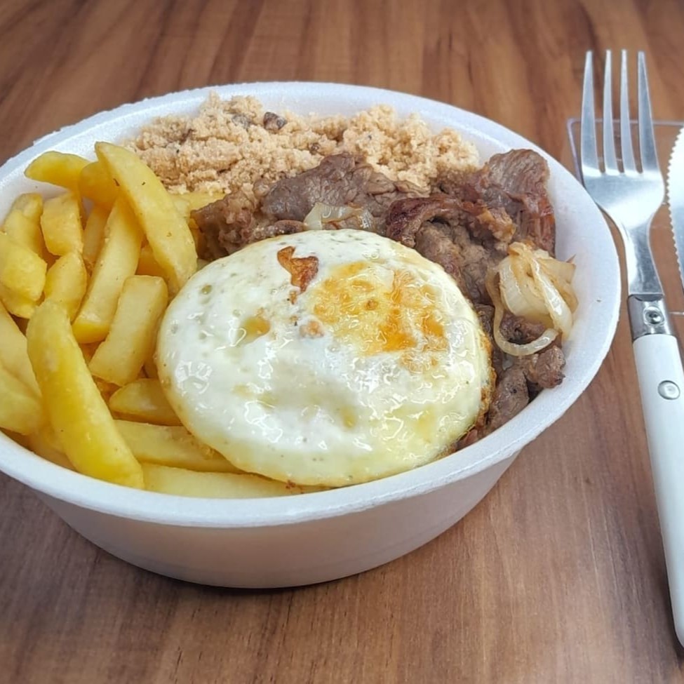 Arroz branco, feijão caseiro, farofa crocante, batata frita dourada e ovo frito. Combinação simples, caseira e deliciosa! ️