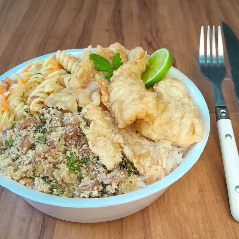 Arroz branco, feijão caseiro, salada de macarronese cremosa e feijão tropeiro.