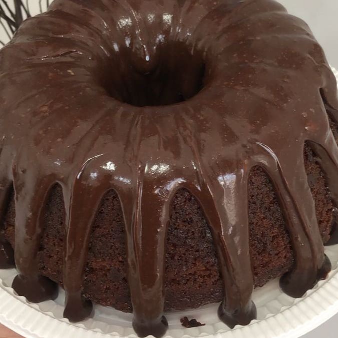 Massa fofinha e molhadinha de chocolate, com cobertura de chocolate 50%. Bolo Caseiro Chocolatudo — 18 cm.
