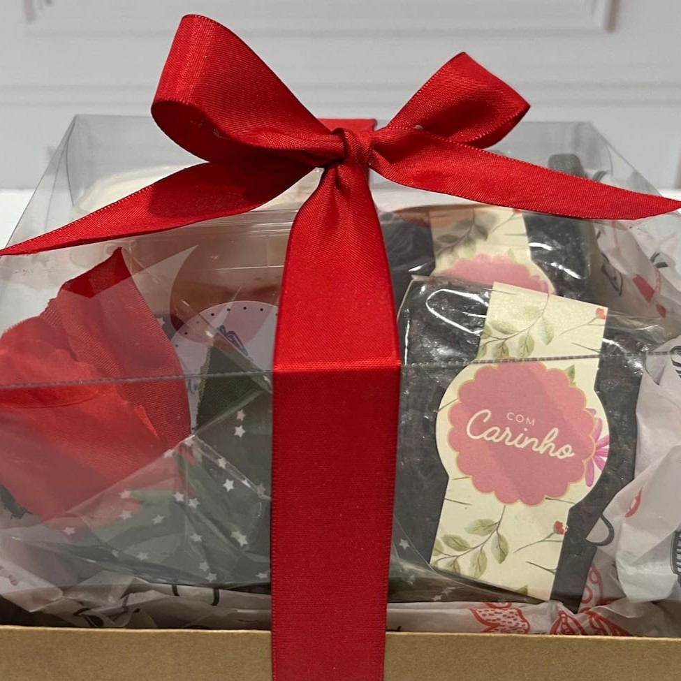 Uma linda caixa com 2 deliciosos brownie recheado , 1 bolo de pote e um belo botão de rosa vermelha , tudo com um charme especial para deixar sua mãe encantada.