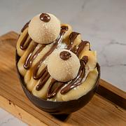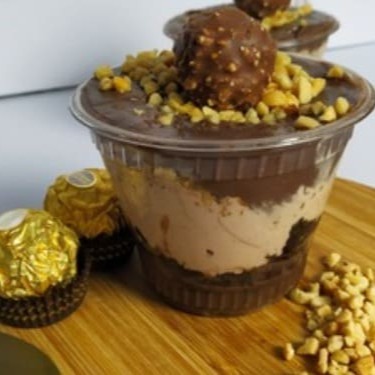 Creme de chocolate meio amargo, brownie , creme de chocolate , amendoim e para terminar com chave de ouro um bombom ferrero inteirinho. copo 250ml
