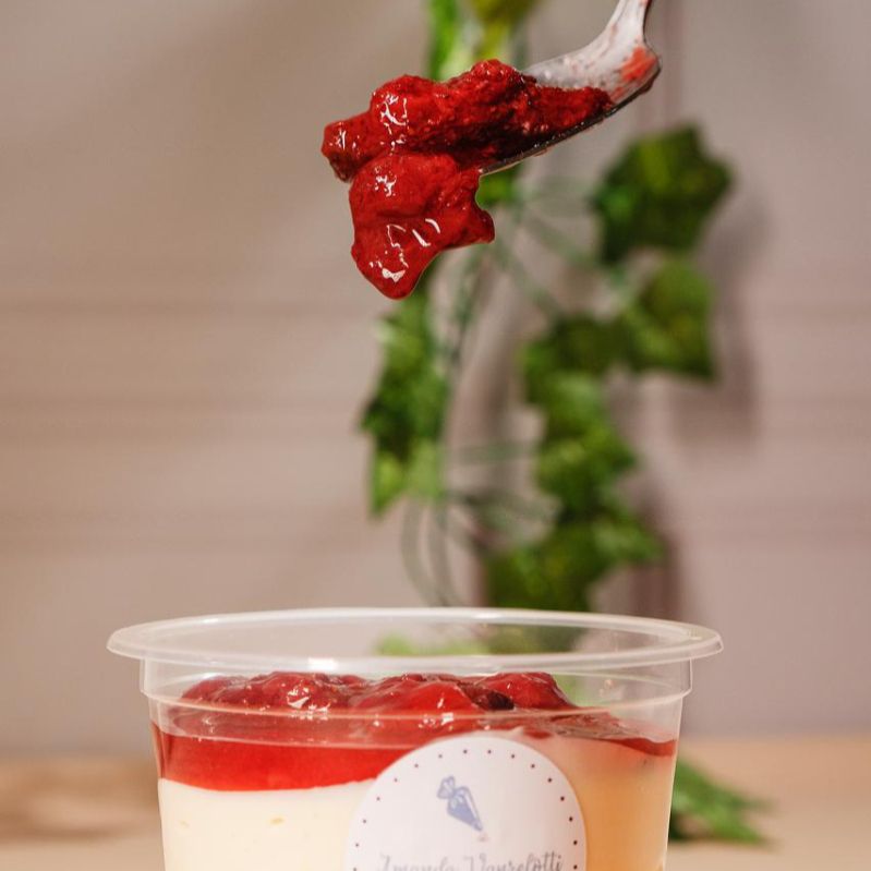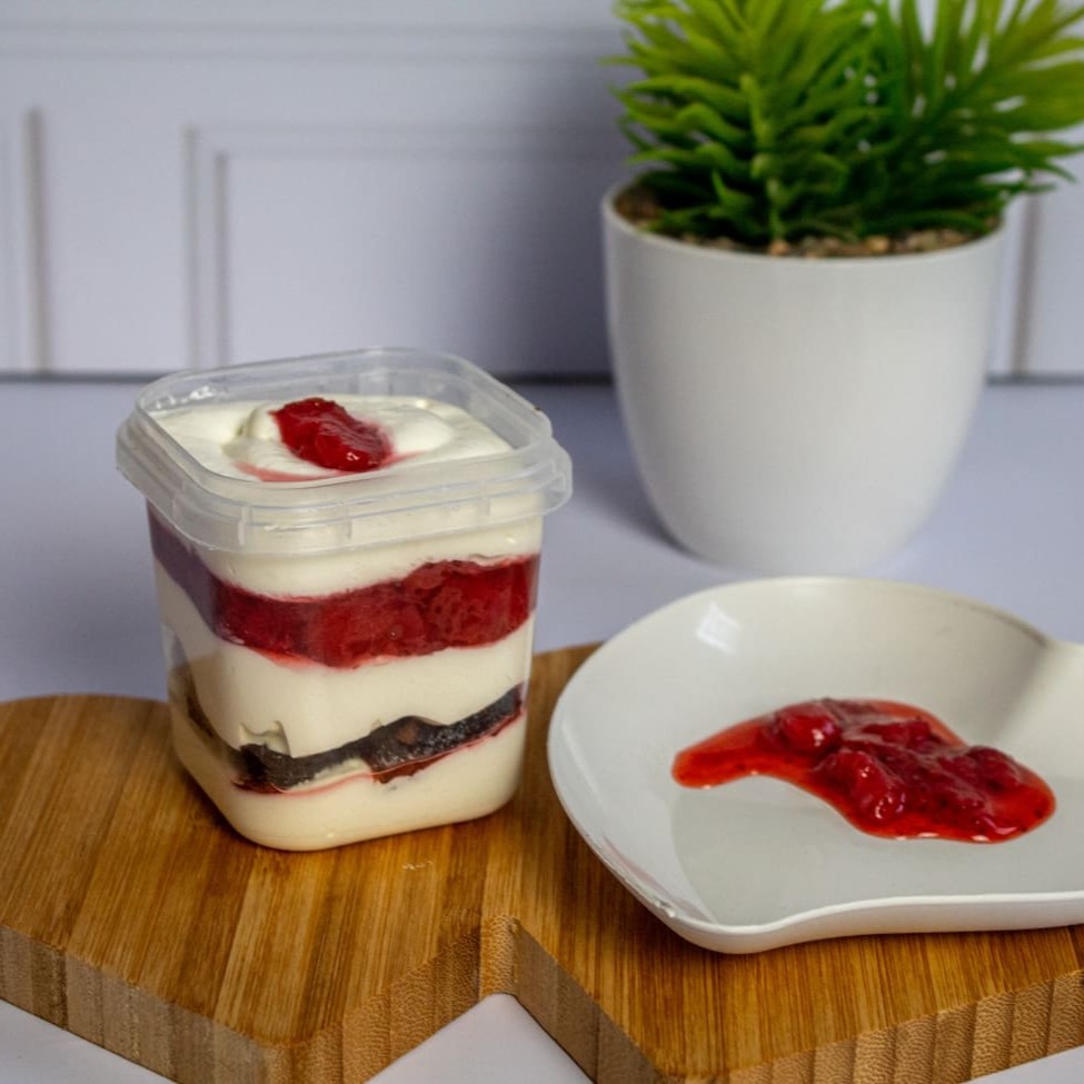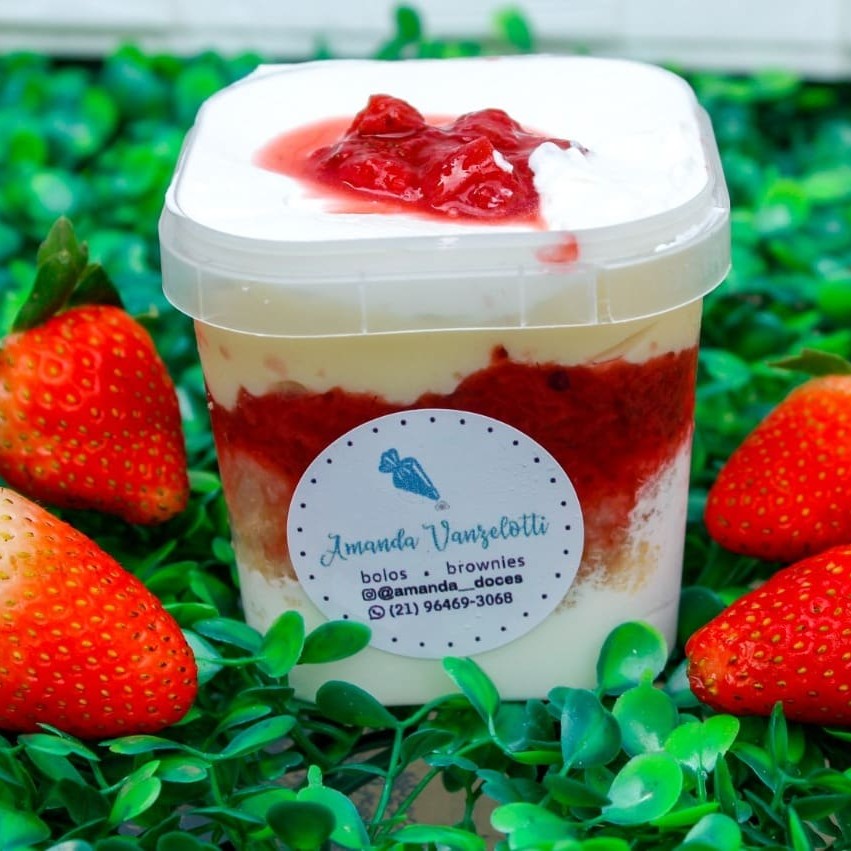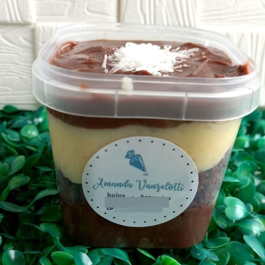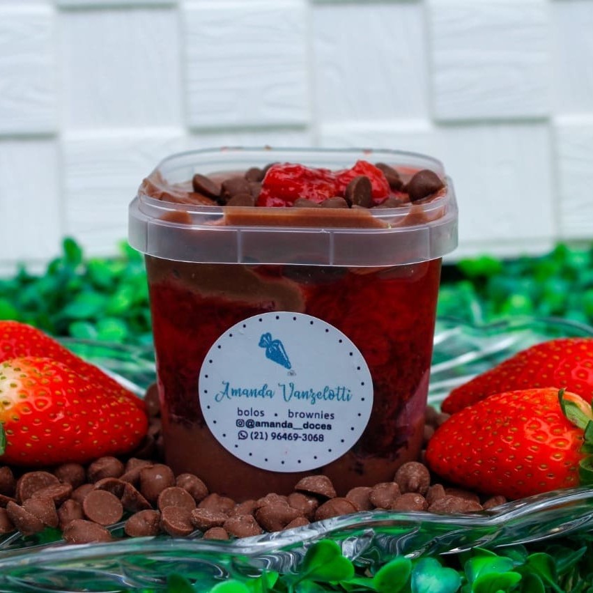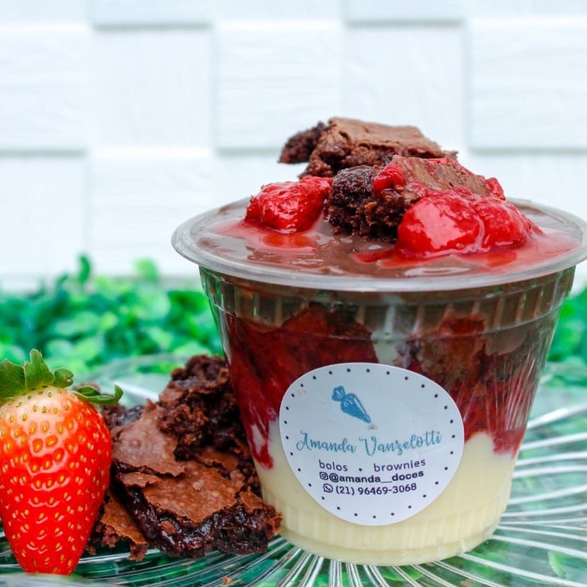 Cremosinho de chocolate meio amargo, brownie e uma deliciosa geleia de morango artesanal. copo 250ml