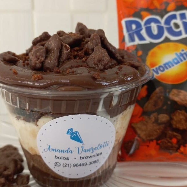 Uma explosão de sabor com cremes de chocolate branco e preto ,brownie, Ovomaltine e para fechar essa delicia pedaços de rocks. copo 250 ml