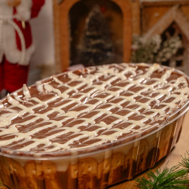 Creme de chocolate cremoso intercalado com biscoito Maizena, coberto por uma camada suave de creme branco e finalizado com ganache de chocolate meio amargo. Perfeito para quem ama equilíbrio entre doçura e intensidade. Serve até 12 pessoas.