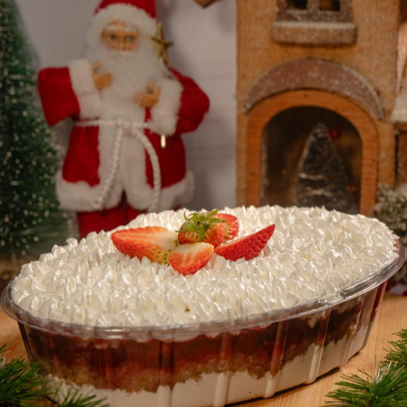 Uma camada de chantininho, com bolo de massa branca. Finalizando com geleia artesanal de morango. Atende até 12 pessoas.