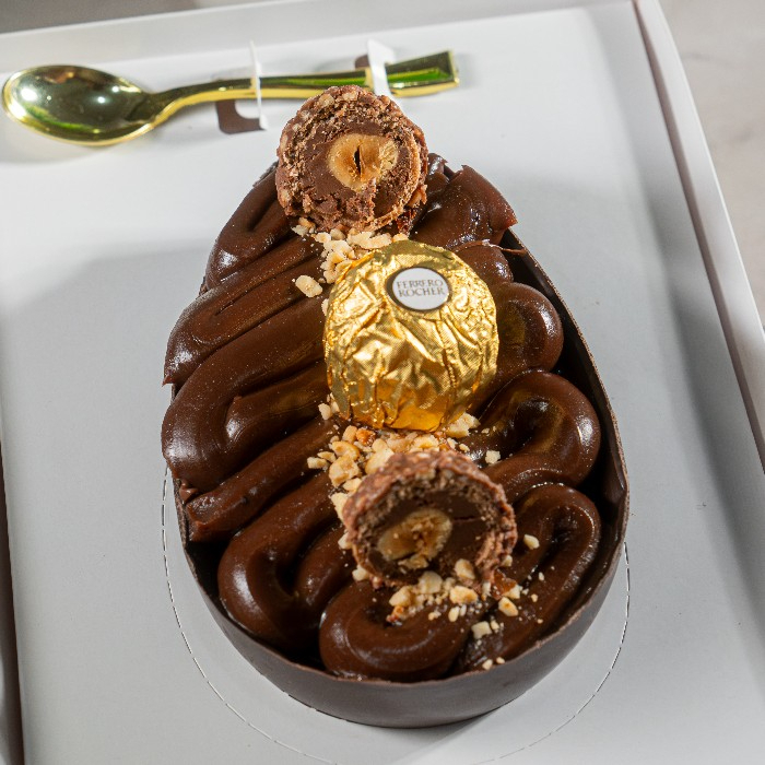 Delicioso ovo de Páscoa recheado com brigadeiro tradicional cremoso, Nutella e amendoim picado, trazendo uma combinação irresistível de sabores. Finalizado com bombom Ferrero Rocher, fios de Nutella e crocante de amendoim para uma experiência única a cada mordida.