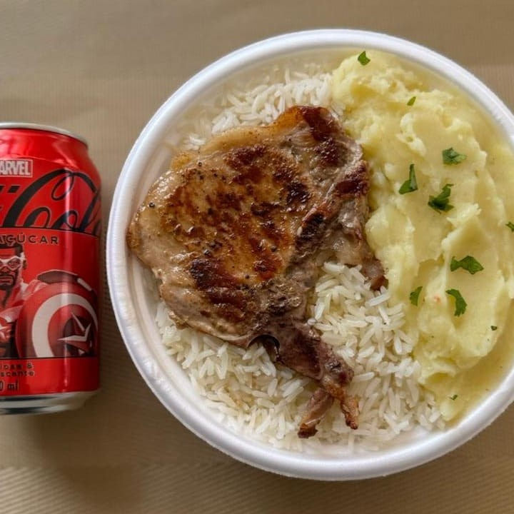 Marmita com deliciosa bisteca suína preparada com arroz branco, feijão e purê de batata inglesa. Acompanha refrigerante Coca Cola lata Zero sem açúcar 350ml bem gelada. Marmita indicada para 01 pessoa.