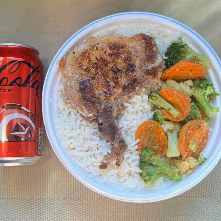 Marmita com deliciosa bisteca suína preparada com arroz branco, feijão e mix de legumes. Acompanha refrigerante Coca Cola lata Zero sem açúcar 350ml bem gelada. Marmita indicada para 01 pessoa.