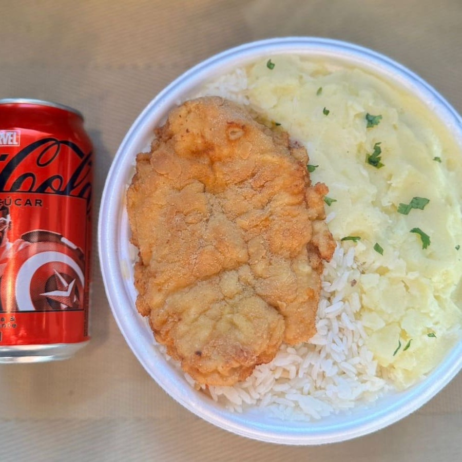 Marmita com delicioso filé de frango empanado na massa crocante acompanhado de arroz branco, feijão e purê de batatas inglesas. Acompanha refrigerante Coca Cola lata Zero sem açúcar 350ml bem gelada. Marmita indicada para 01 pessoa.