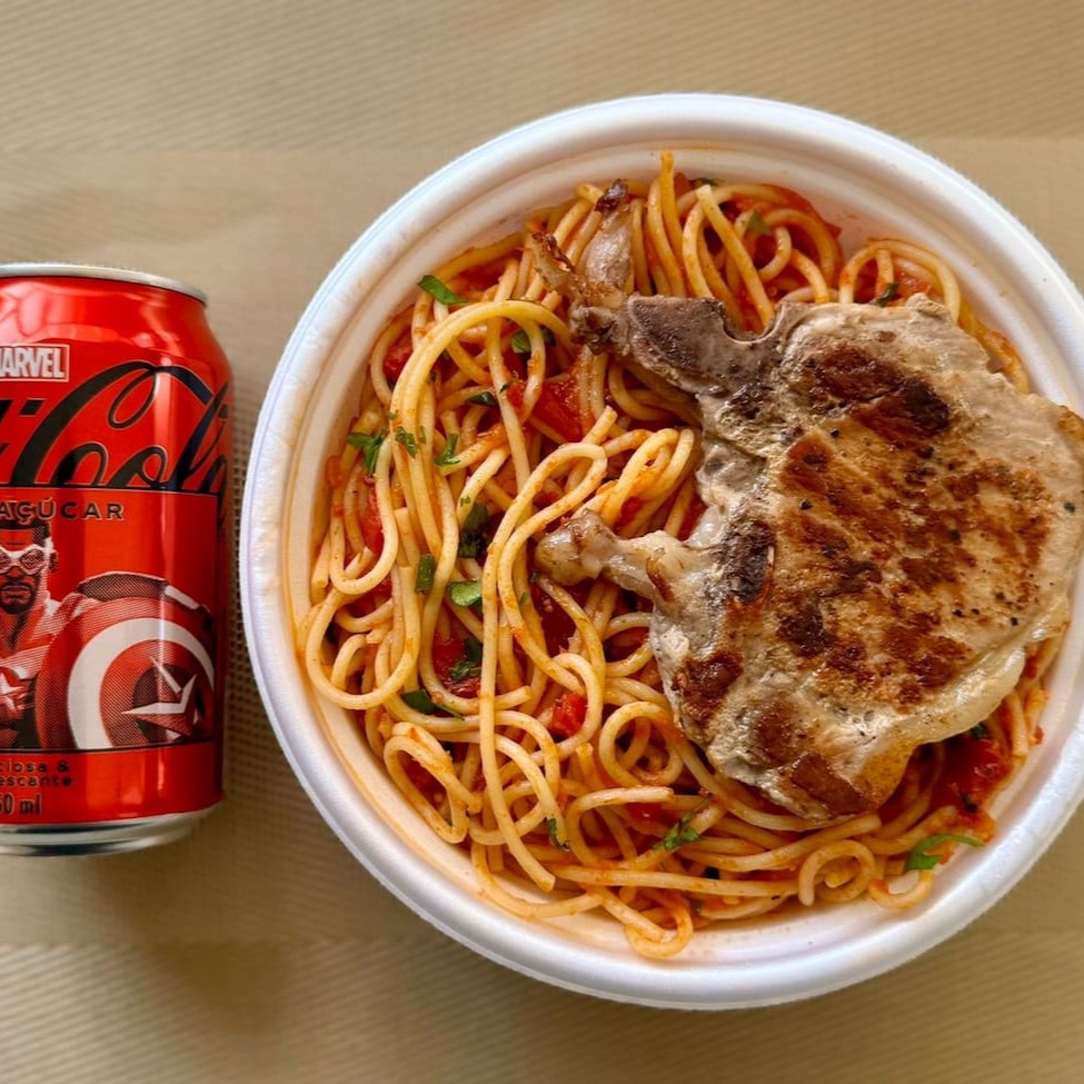 Marmita com deliciosa bisteca suína grelhada acompanhada de macarrão espaguete ao molho de tomates. Acompanha refrigerante Coca Cola lata Zero sem açúcar 350ml bem gelada. Marmita indicada para 01 pessoa.