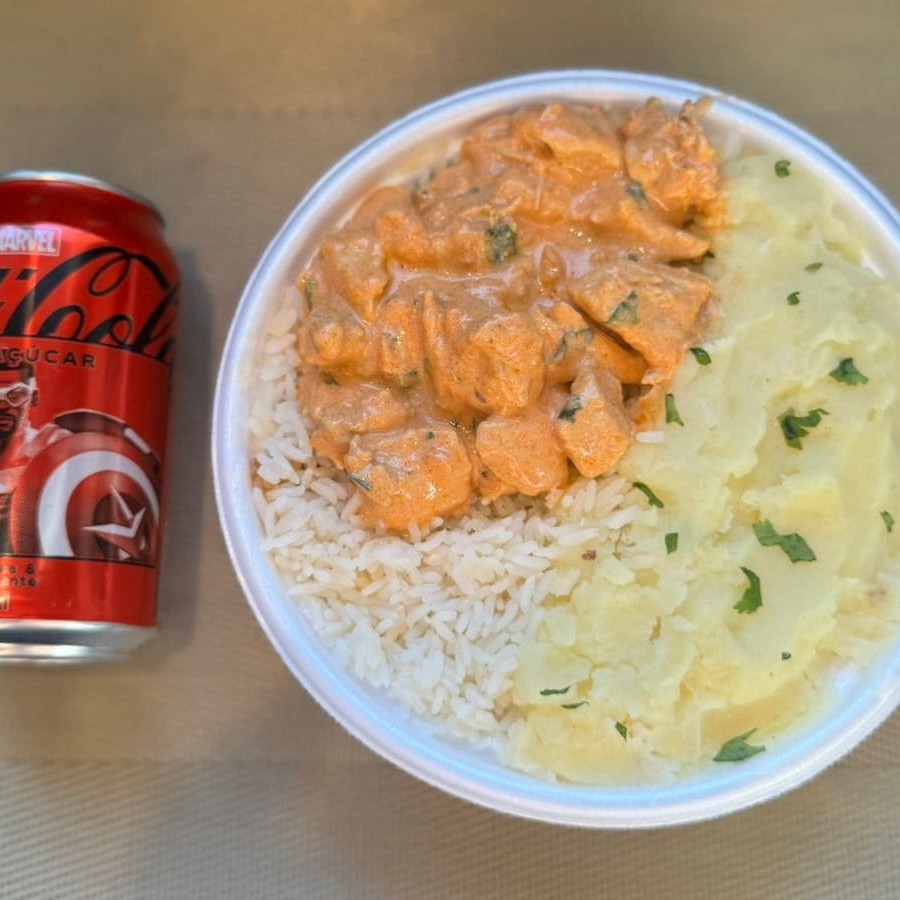 Marmita com delicioso filé de frango ao molho estrogonofe acompanhado de arroz branco e purê de batatas inglesas. Acompanha refrigerante Coca Cola lata Zero sem açúcar 350ml bem gelada. Marmita indicada para 01 pessoa.