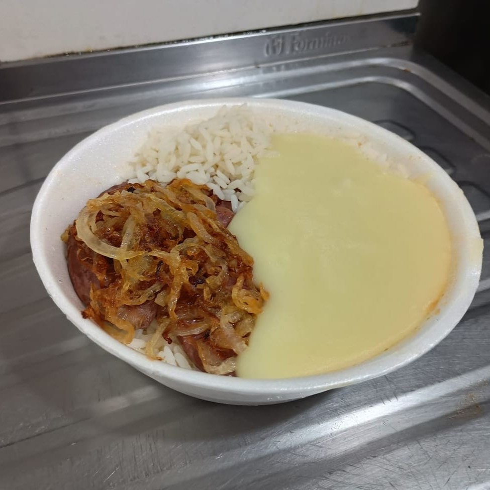 Calabresa acebolada acompanhada de um delicioso purê de batata inglesa e arroz. Serve 1 pessoa.