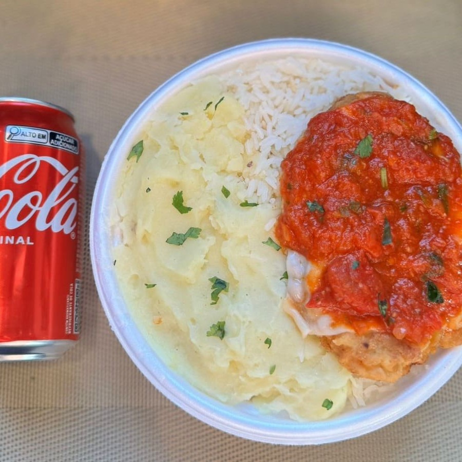 Marmita com delicioso filé de frango parmegiana (empanado na massa crocante coberto com molho de tomates e queijo) acompanhado de arroz branco e purê de batatas inglesas. Acompanha refrigerante lata Coca Cola 350ml bem gelada. Marmita indicada para 01 pessoa.