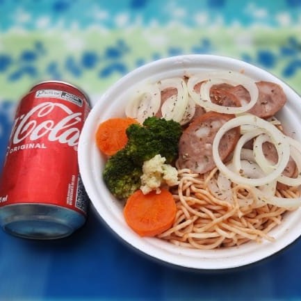 Calabresa acebolada acompanhada com um espaguete ao molho e legumes refogados. Acompanha uma Coca- Lata normal 350ml geladíssima. Serve 1 Pessoa.