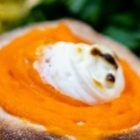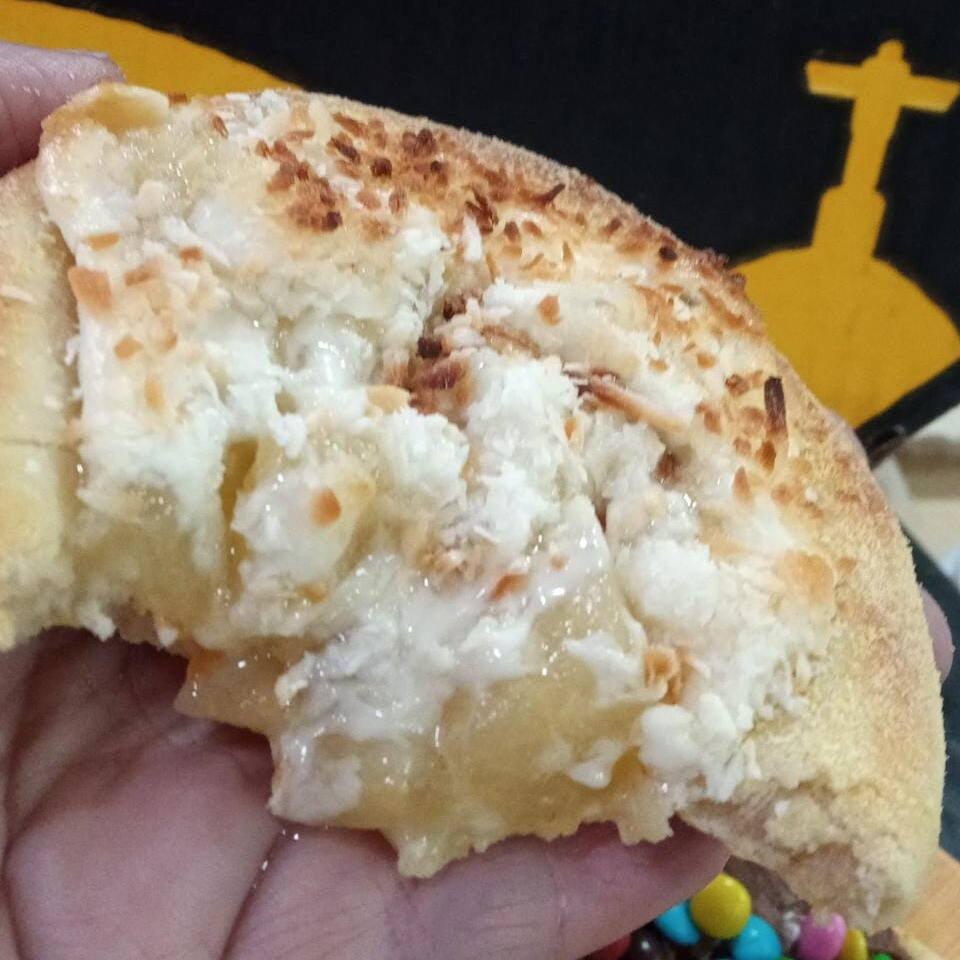 Massa especial da casa, chocolate branco, abacaxi e coco ralado gratinado.