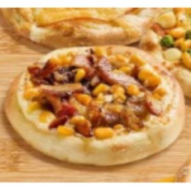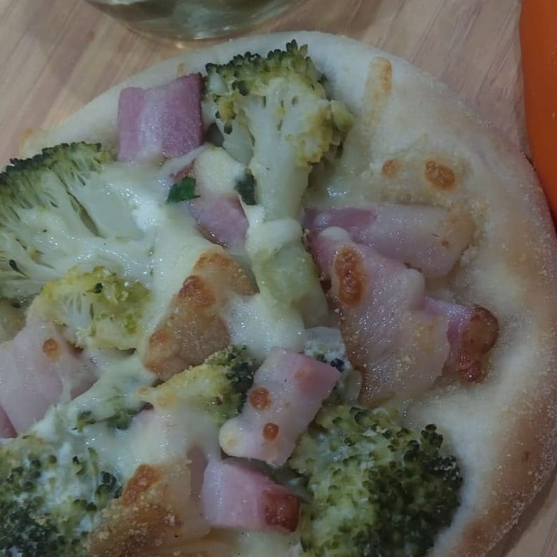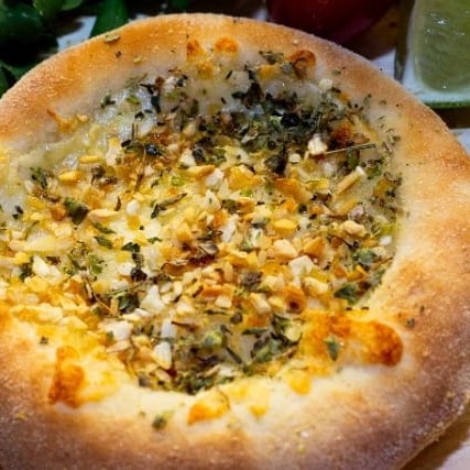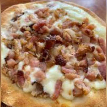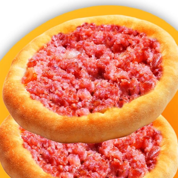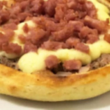 Massa da casa, mussarela, cheddar, carne moída e bacon.