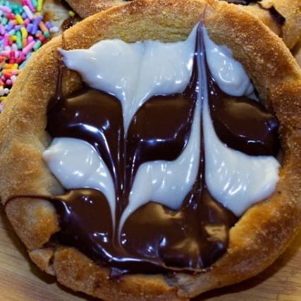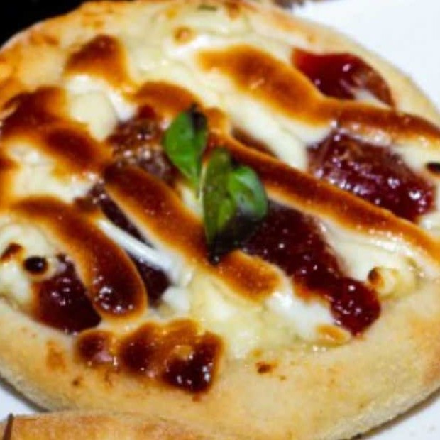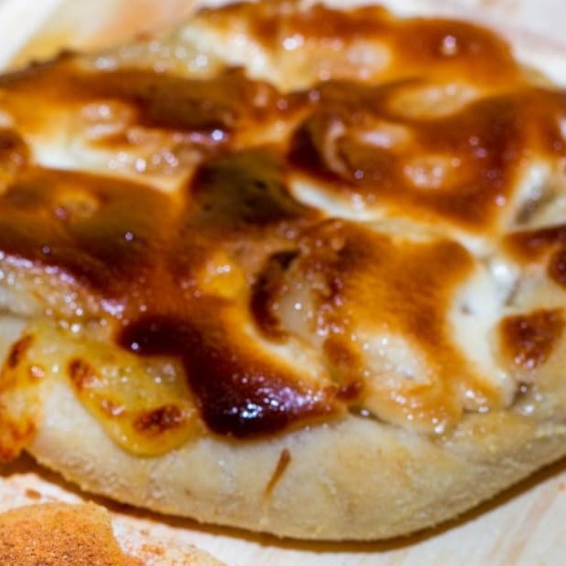 Massa especial da casa, mussarela, banana, chocolate branco.