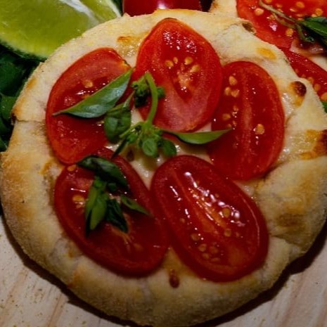 Massa especial da casa, mussarela, tomate, manjericão e orégano.