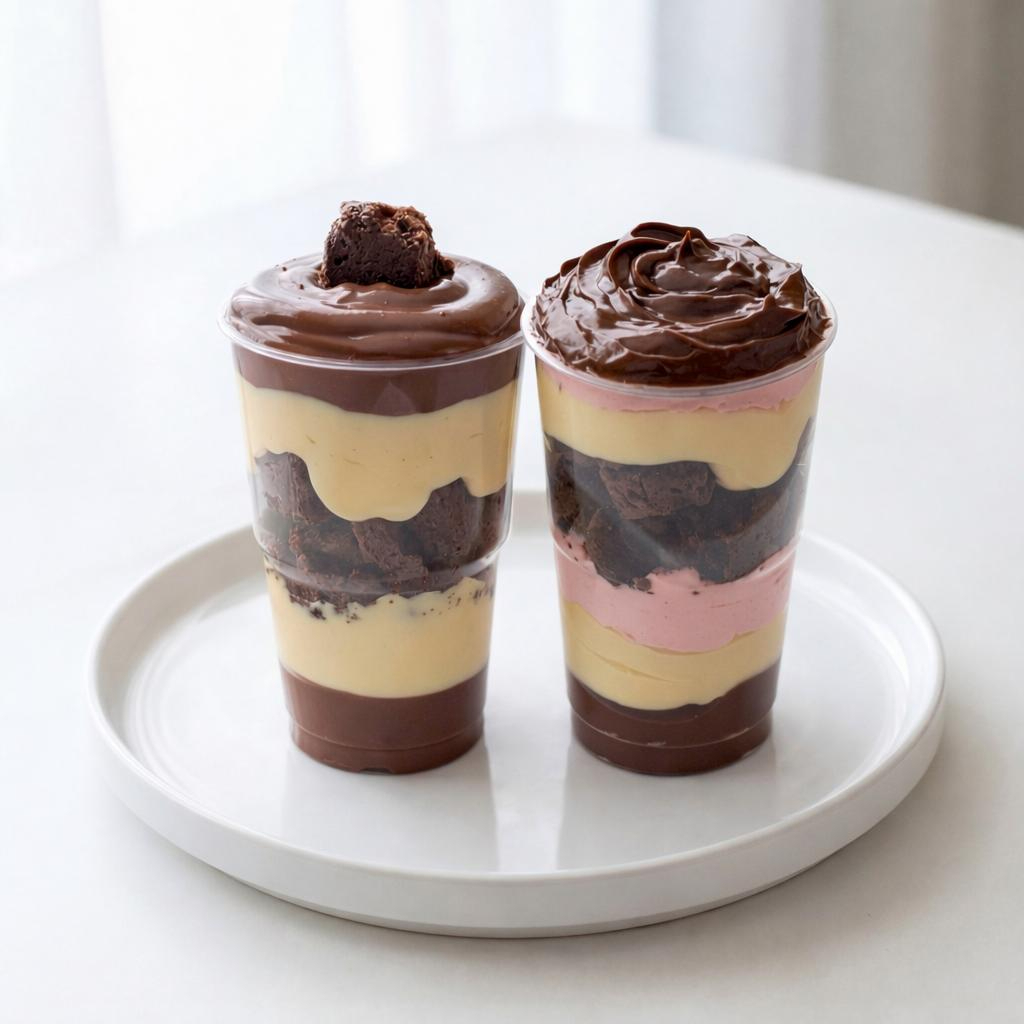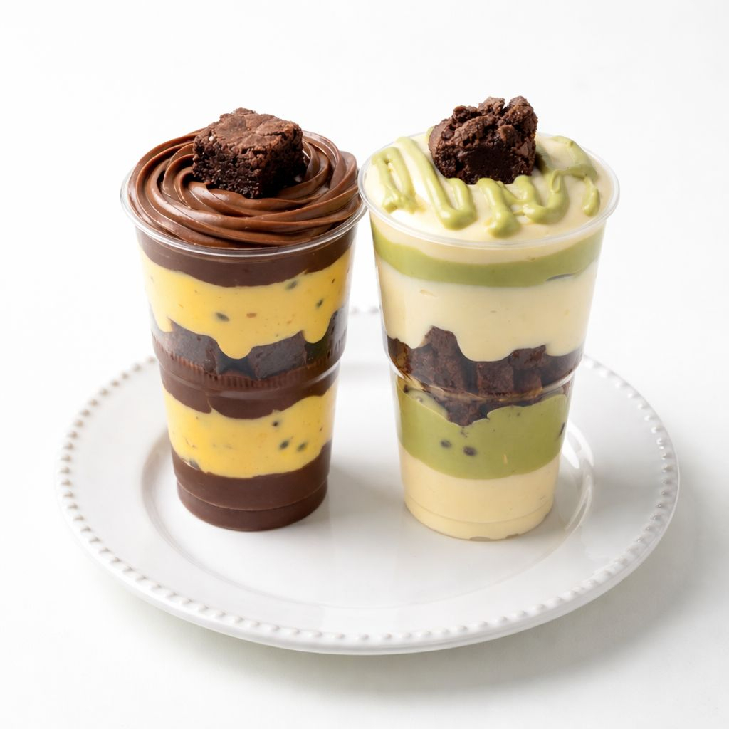Com Duplo da Felicidade: A dose perfeita de doçura em dobro! Um copo é o Ninho & Chocolate, com camadas de Brigadeiro de Chocolate, Brigadeiro de Ninho e pedaços de Brownie super macios. O outro é o Tri Sensação, uma combinação deliciosa de Brigadeiro de Chocolate, Brigadeiro de Ninho, Mousse de Morango e Brownie. Feitos artesanalmente, com muito amor e ingredientes selecionados pra adoçar o seu dia do jeitinho certo!