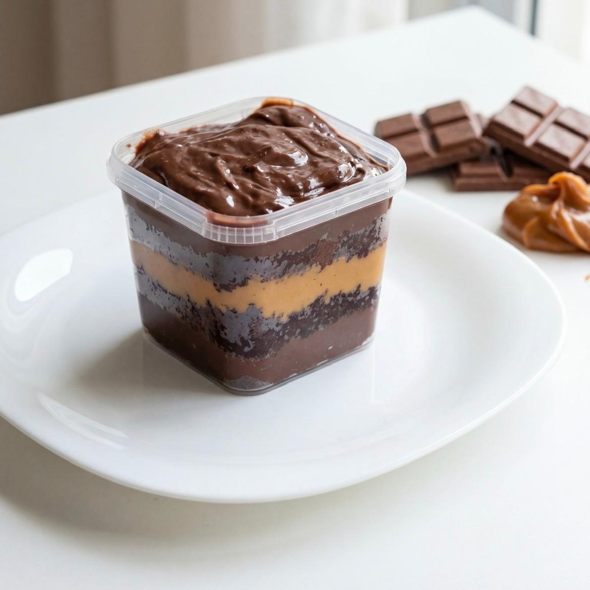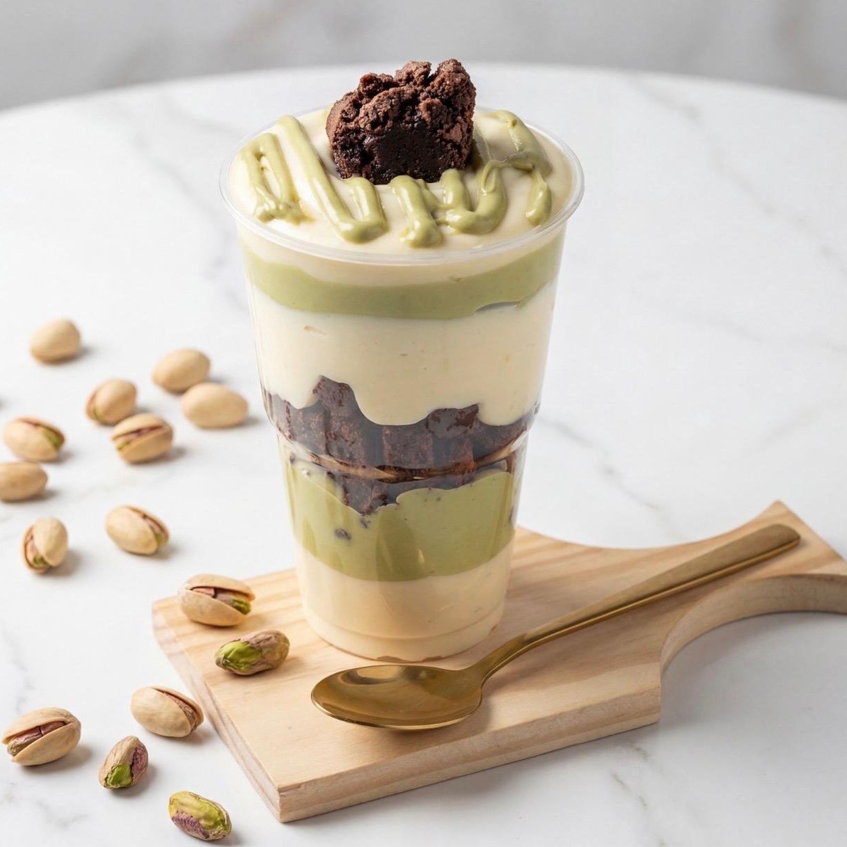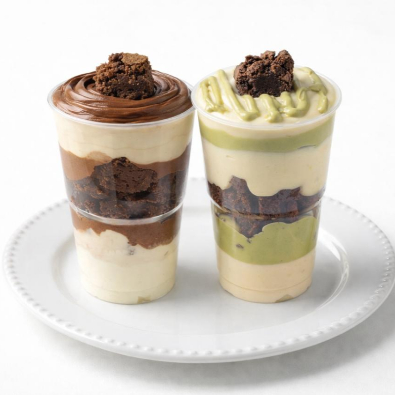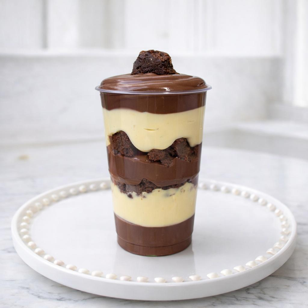 Uma experiência doce e refinada: camadas de brigadeiro gourmet de pistache, brigadeiro cremoso de leite Ninho e brownie artesanal de chocolate intenso. Texturas envolventes e sabores que se harmonizam com elegância a cada colherada. (aprox.300g) ——— tags ———