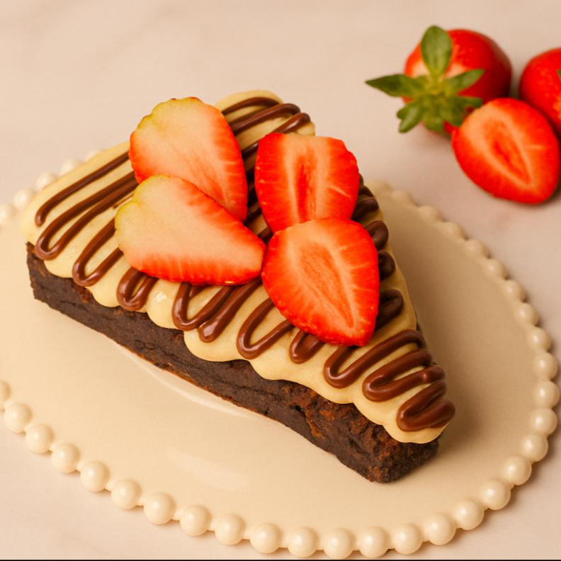 Uma deliciosa pizza de brownie super mac macia e chocolatuda, coberta com um brigadeiro de Ninho cremoso e finalizada com generosos fios de Nutella. Para completar, morangos frescos que trazem o toque perfeito de frescor e elegância. Uma explosão de sabor em cada pedaço!