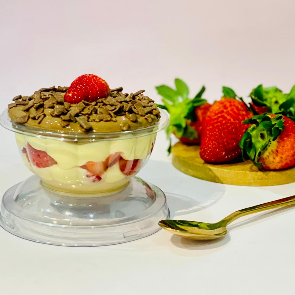 Uma explosão de sabores que derrete na boca: morango fresquinho, Brigadeiro de Ninho apaixonante e Brigadeiro de chocolate. Uma tentação que você não vai resistir.