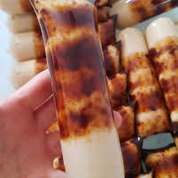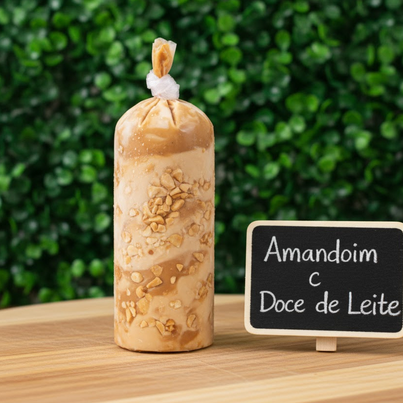 Creme de amexa e doce de leite coberto por uma deliciosa calda com pedaços de amexa