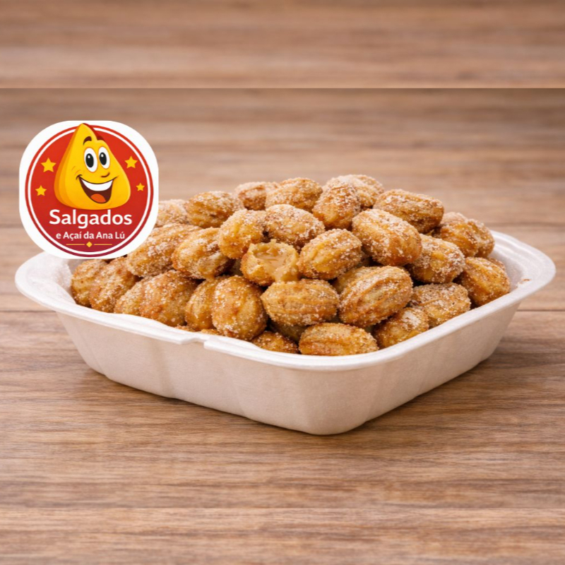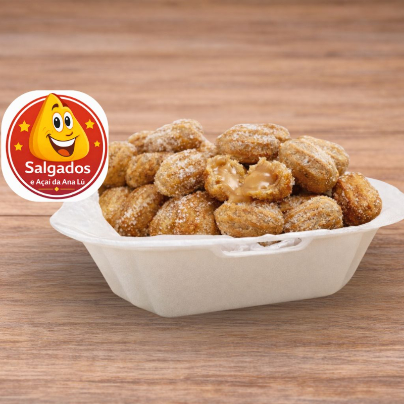 Mini Churros Recheado com Doce de Leite tamanho festa (aprox. 14g a 18g por unidade). Fritos na hora e finalizados com açúcar e canela. Macio e doce de leite derretido por dentro.