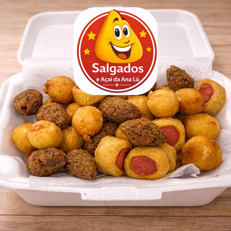 OBS: Na Promo PAGUE 30 LEVE 40, o recheio dos 10 bolinhos extras, a loja escolhe. Massa macia por dentro e dourada por fora. Frito na hora. Recheios de: carne moída, carne seca e queijo. Tamanho de festa, de 14 a 18 gramas, varia conforme o recheio. Salgadinhos tamanho festa (aprox. 14g a 18g por unidade). Produto industrializado massa e recheio previamente cozidos, mantidos congelados a -18c e fritos no momento do pedido entre 180c e 200c. Pode conter glúten, leite, soja e derivados. Produzido em ambiente que manipula carnes, frutos do mar e outros alergênicos. ️ Alergênicos: Podem conter ou apresentar traços de: Glúten (trigo), Leite e derivados (mussarela), Soja, Ovos, Carne bovina, Carne suína, Frango e Crustáceos (camarão). Pessoas com restrições alimentares ou alergias devem se informar antes de realizar o pedido.