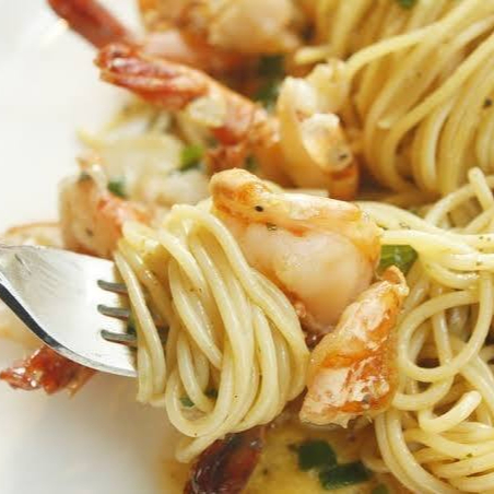 Espaguete Com Camarão Coberto Com Queijo Parmesão Ralado