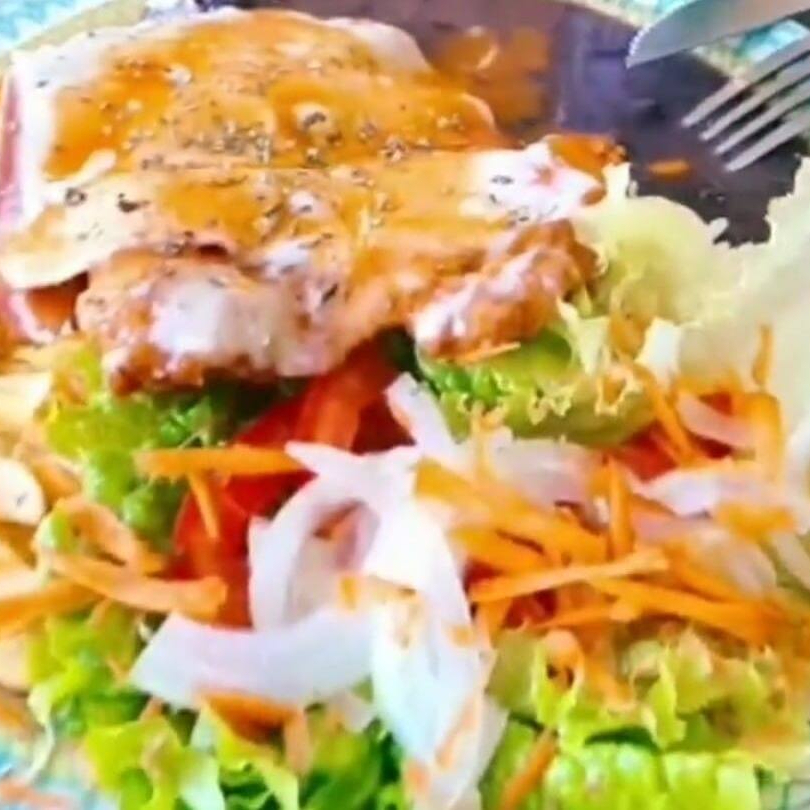Filé de Peixe Grelhado com Salada de Tomates Frescos, Alface Crespo, cenoura e cebola