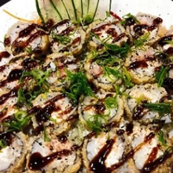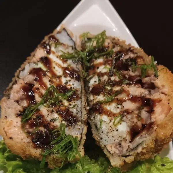 Salmão, arroz e cream cheese em massa de tempura frito, partido ao meio e maçaricado.