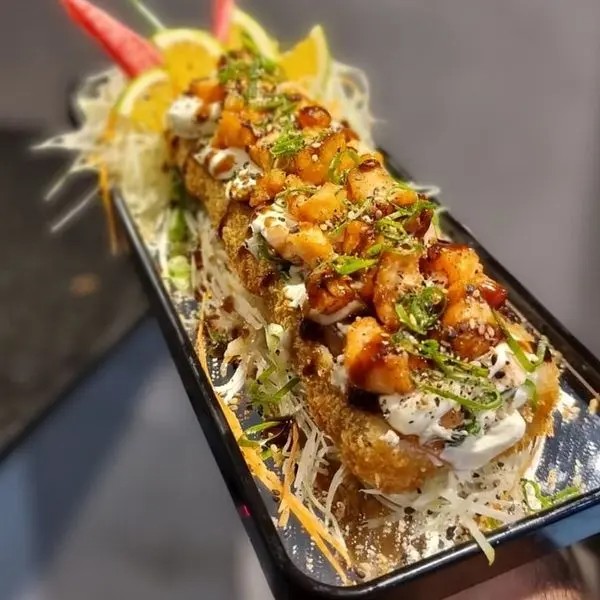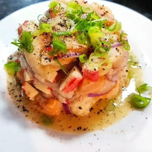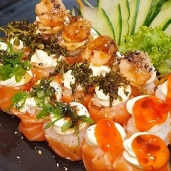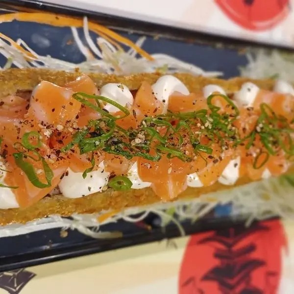 Casquinha crocante, salmão, camarão, cream cheese e cebolinha.