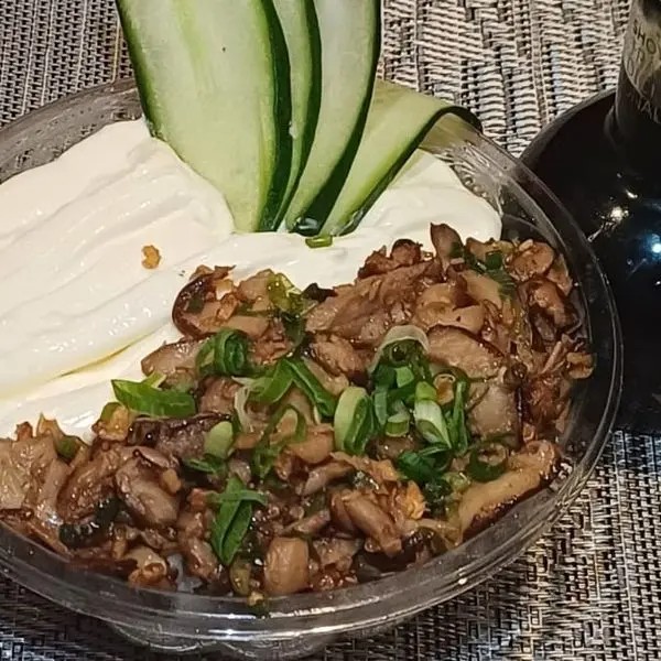 Shitake temperado c/ hondashi, Ajinomoto, limão,cebolinha e gergelim. Arroz c/gergelim, cream cheese e leque de pepino.