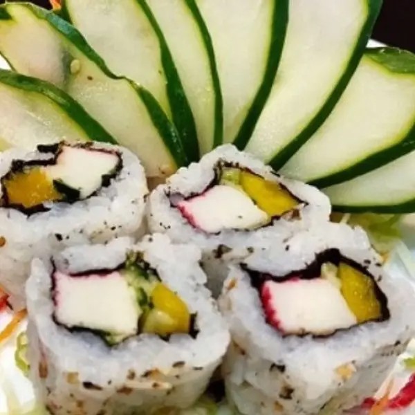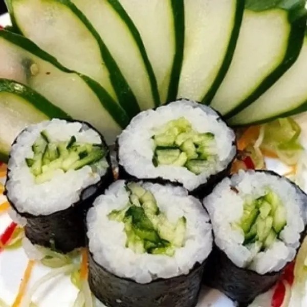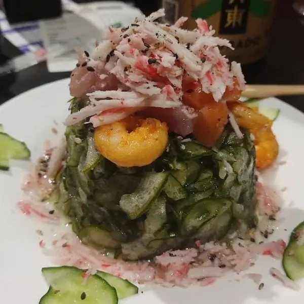 Alga, arroz, kani, pepino e gergelim.