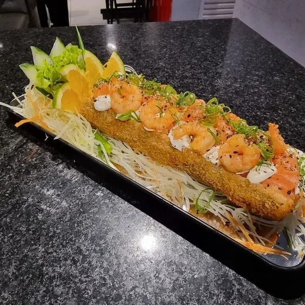Hot filadelfia recheado com: cream cheese, salmão, camarão, cebolinha e gergilin.