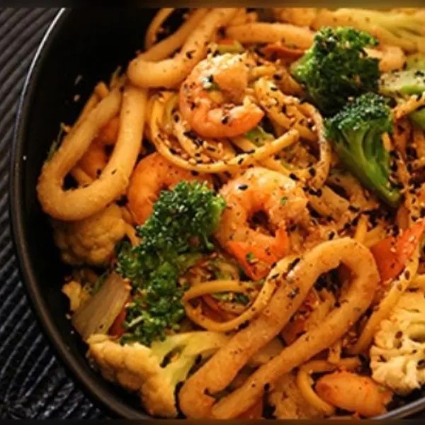 Lámen, legumes e frutos do mar. (camarão, lula, polvo)