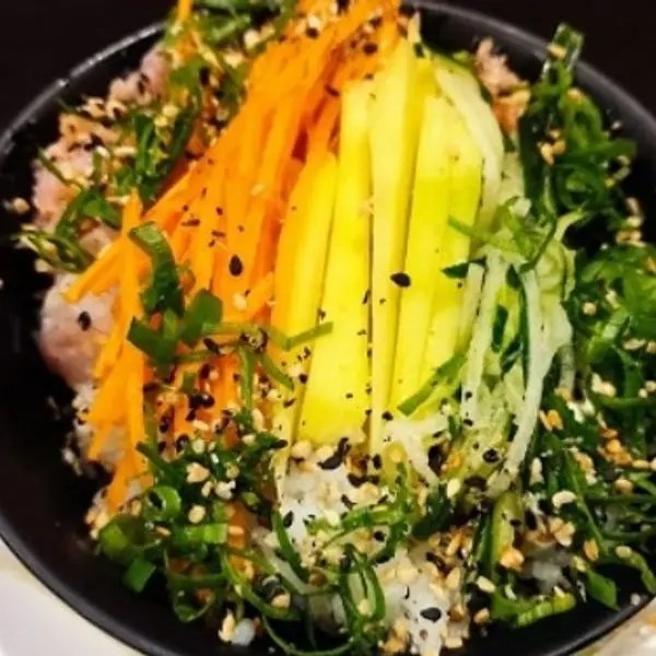 Salmão/atum e peixe branco temperados c/ hondashi,Ajinomoto, cebolinha e gergelim arroz c/ gergelim, manga, cenoura e pepino fatiados.