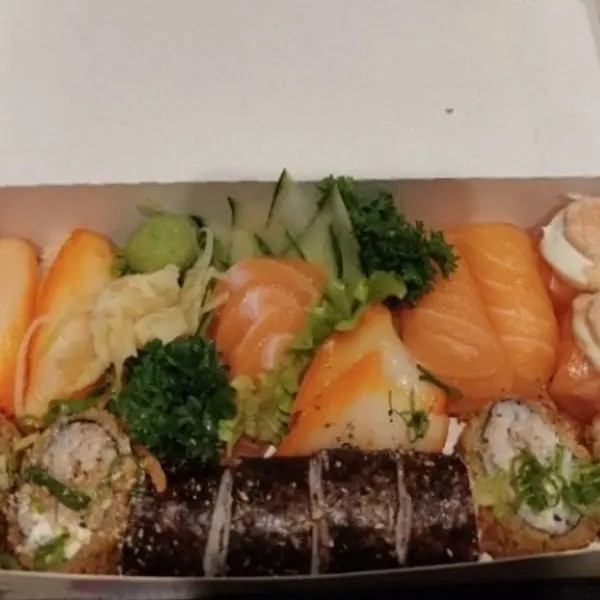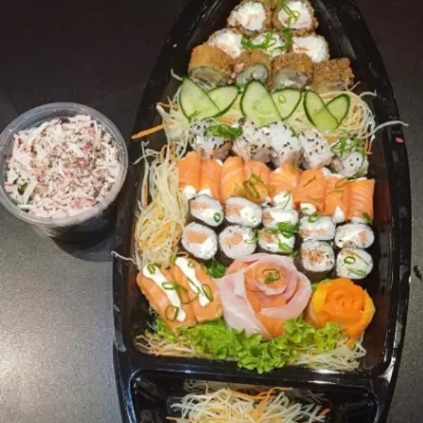 10 sashimis de salmão, 2 sushis de salmão, 4 joes de arroz, 10 Filadélfia 10 Hot Filadélfia, 5 Filadélfia Uramaki.