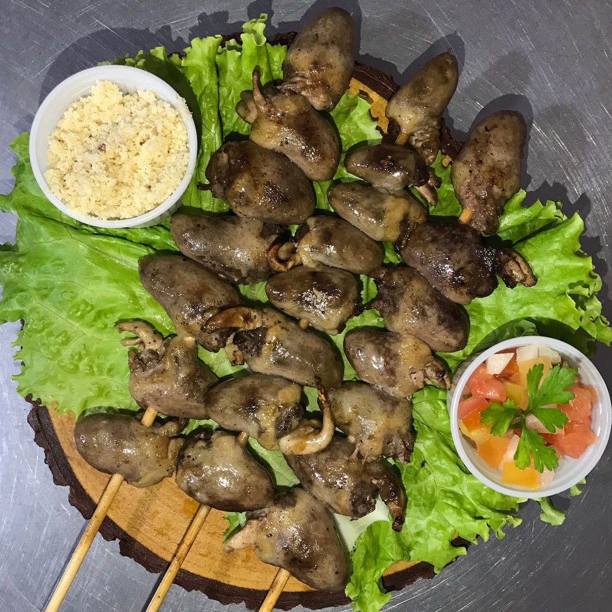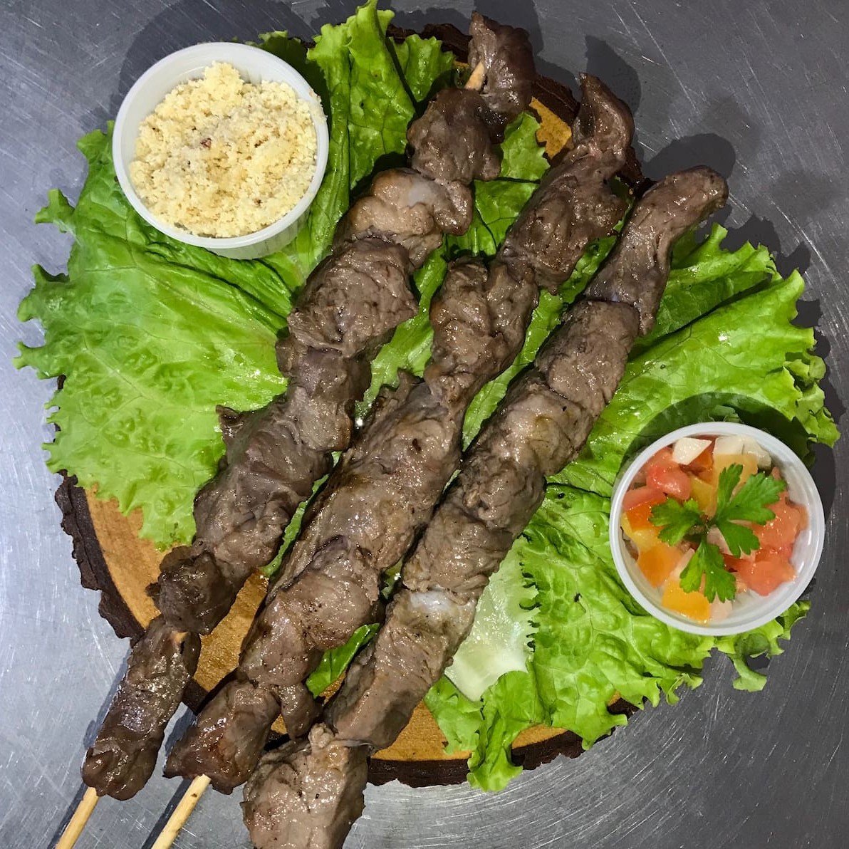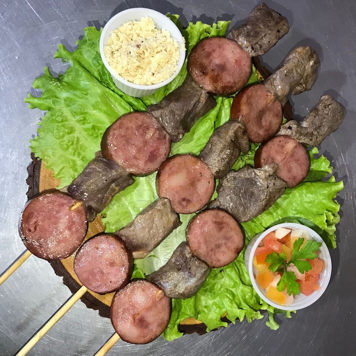 Macarronese, molho à campanha, farofa e 1 espeto coração.