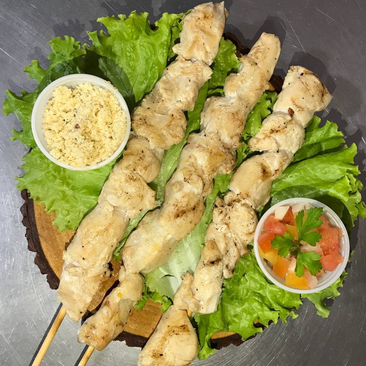 Macarronese, molho à campanha, farofa e 1 espeto frango.