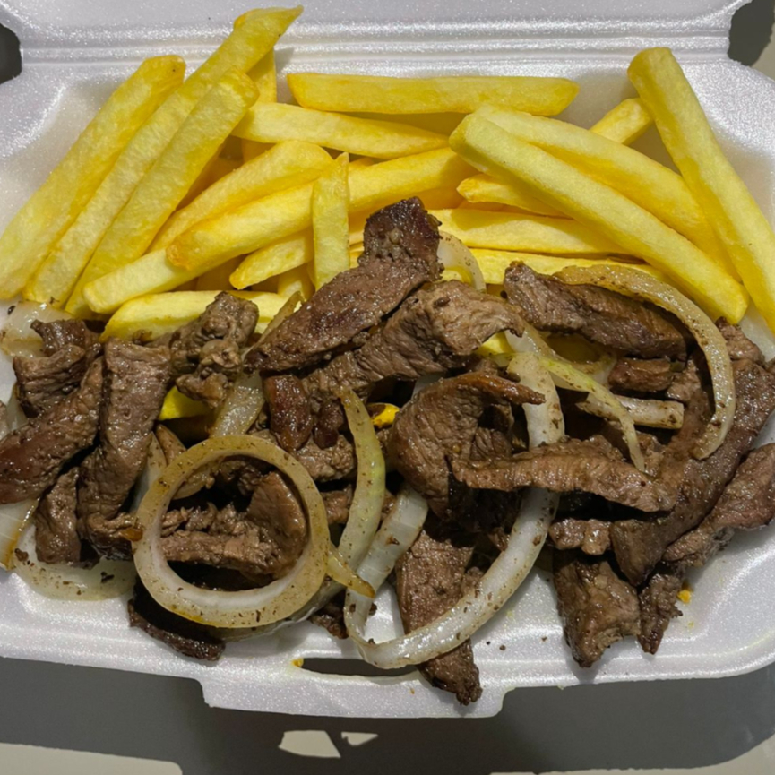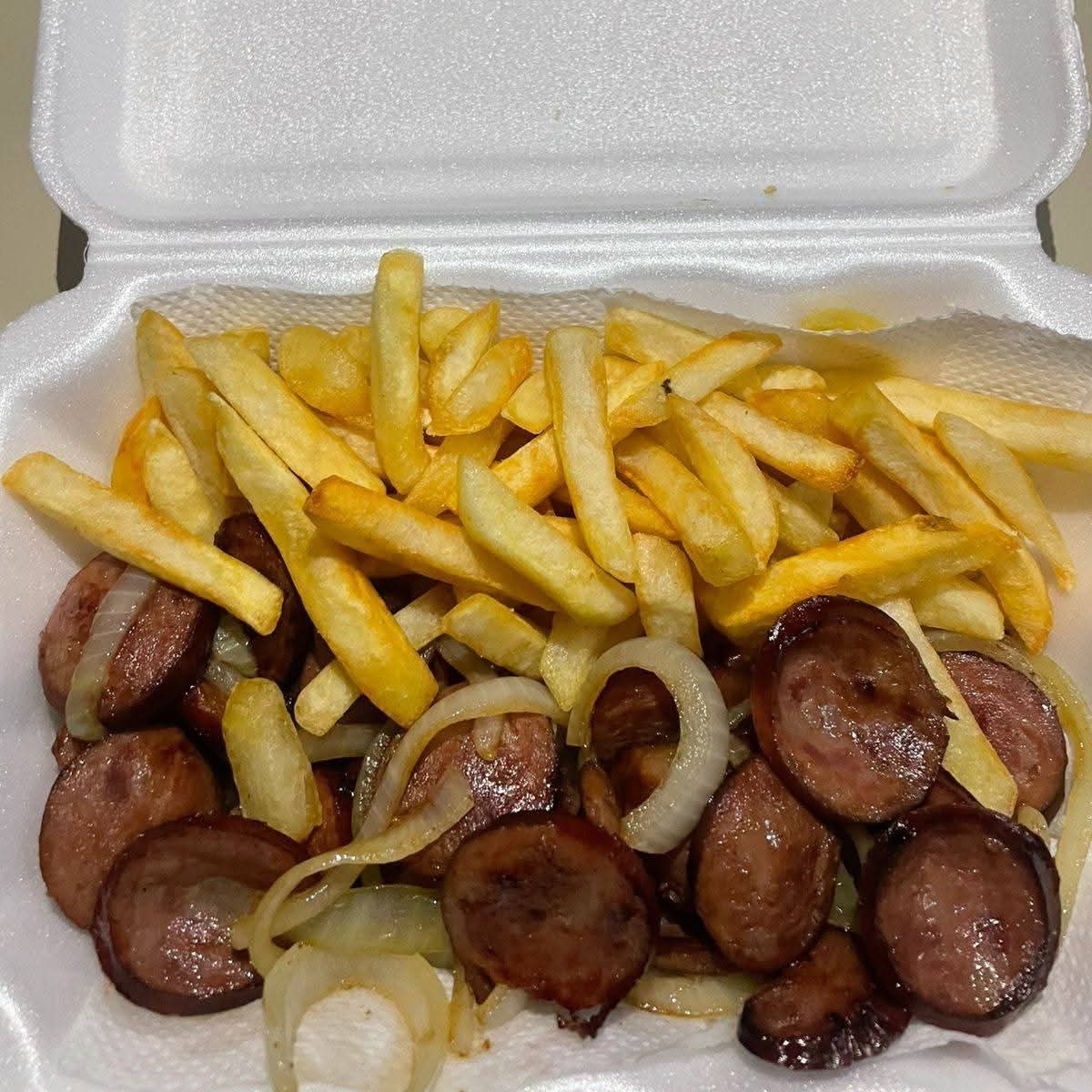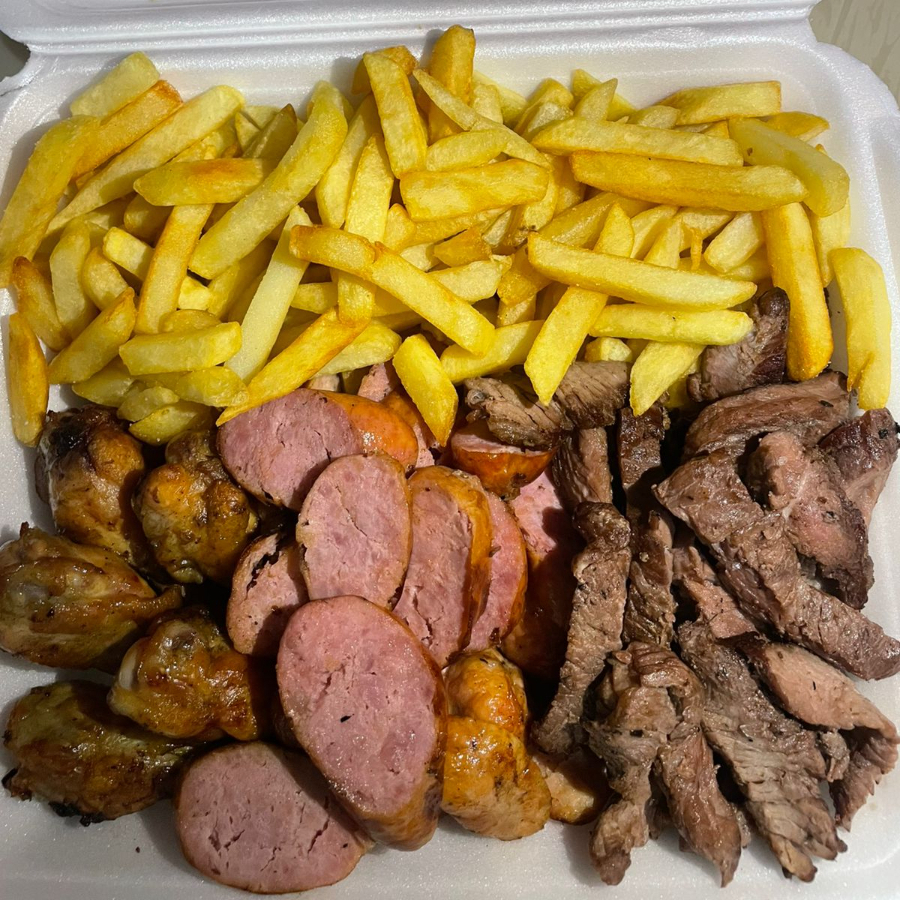Porção de Drumet, Linguiça suina e de frango e alcatra com batata fritas.