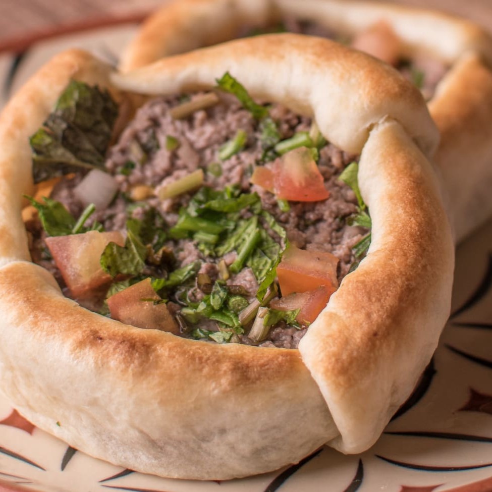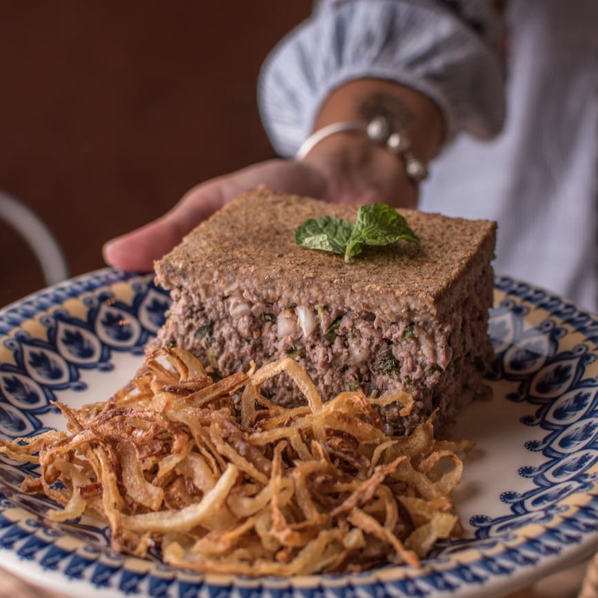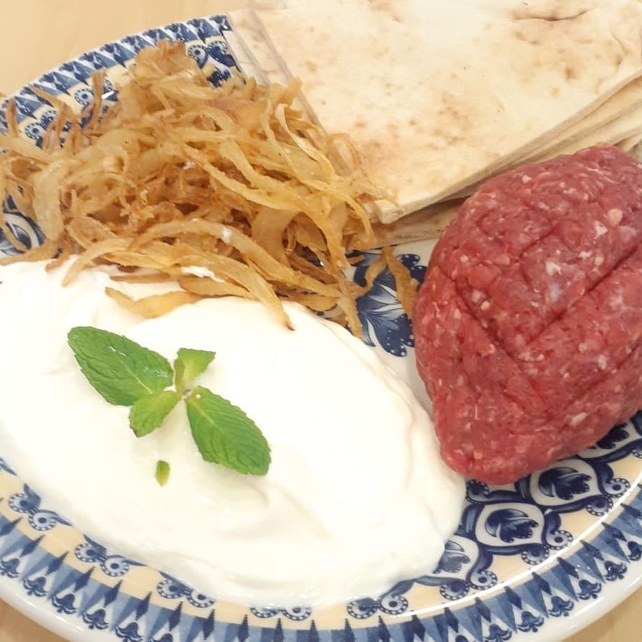 12. Kibe Cru + Coalhada Seca + Cebola Frita + Pão Arabe