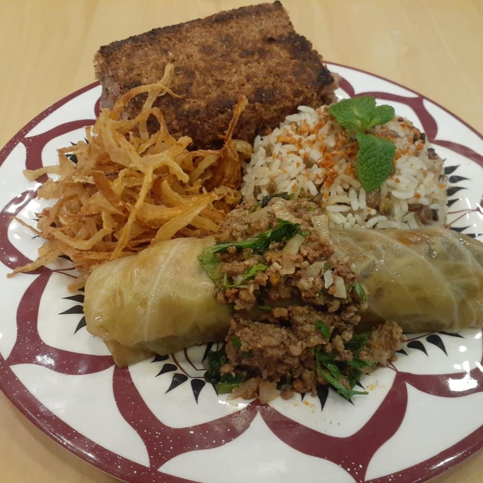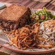 Arroz com lentilha + cebola frita + (kafta vegana ou kibe de forno vegano) + salada (Tabule ou Fatouche)