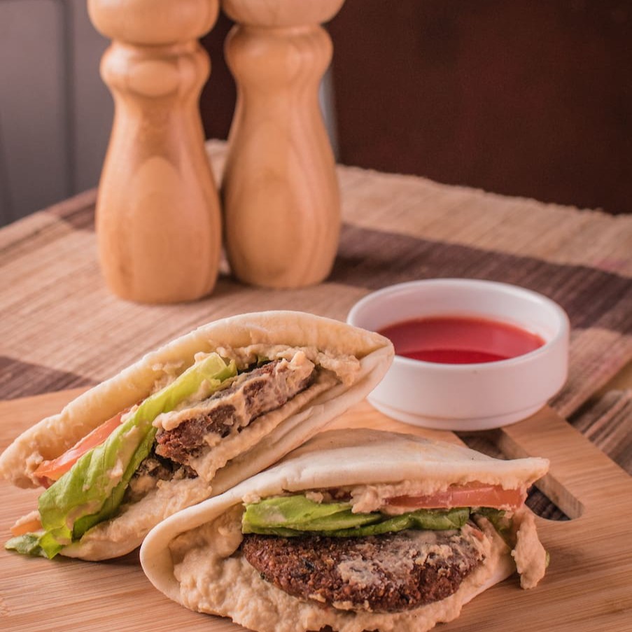 Pão árabe, hummus tahine, tomate, alface, falafel.