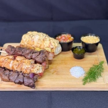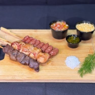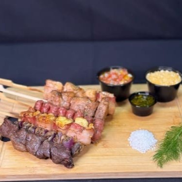 6 espetos à escolha acompanhados de vinagrete, farofa panko crocante, chimichurri, batata pequena e 1 sobremesa.