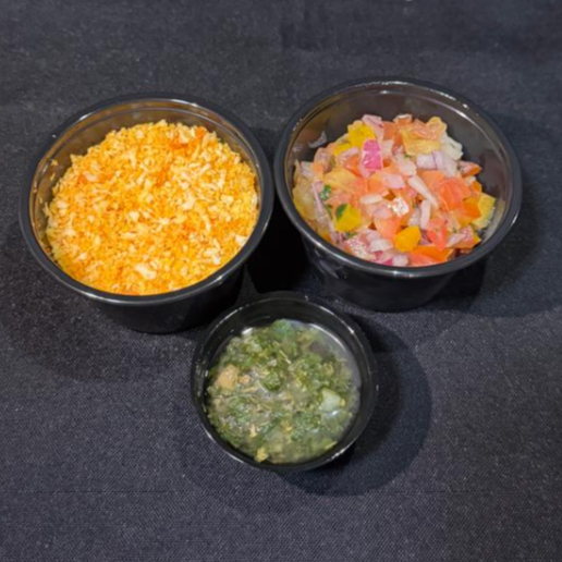 Guarnição da casa com vinagrete, farofa panko crocante e chimichurri para acompanhar seus espetos.