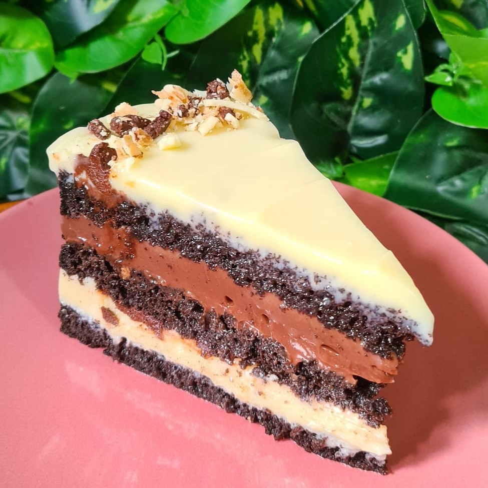 Massa 100% cacau belga bem molhadinha, recheada com brigadeiro de chocolate branco, pedaços de Ouro Branco, brigadeiro belga e coberto com ganache de chocolate branca. Pensa na perfeição de fatia!!!