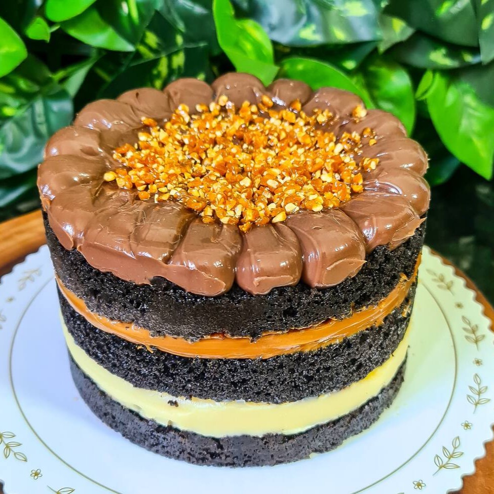 **Atenção: Produto Congelado Para Melhor Transporte** Massa 100% cacau, recheada e coberta com brigadeiro belga, numa massa bem molhadinha. Decorado com flakes de chocolate, brigadeiros e chocolates. Produto enviado congelado, serve até 6 fatias festa, aproximadamente 850grs. Tamanho 13x8cm.